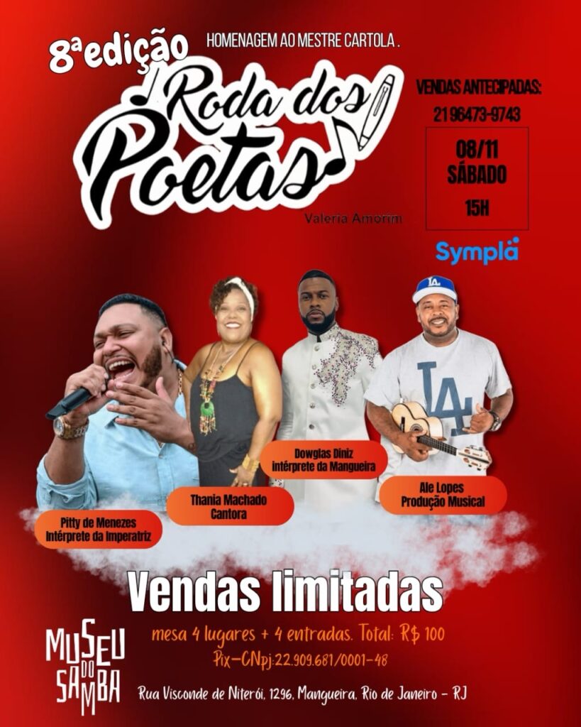O Museu do Samba, na Mangueira, será palco de uma grande celebração à poesia e à música carnavalesca neste sábado, 8 de novembro, a partir das 15h, com a realização da 8ª edição do concurso cultural Roda dos Poetas. Após o sucesso da última edição no Tijuca Tênis Clube, o evento chega pela primeira vez ao espaço histórico dedicado à preservação da memória do samba, reunindo compositores e poetas do carnaval carioca em uma tarde de arte e emoção.