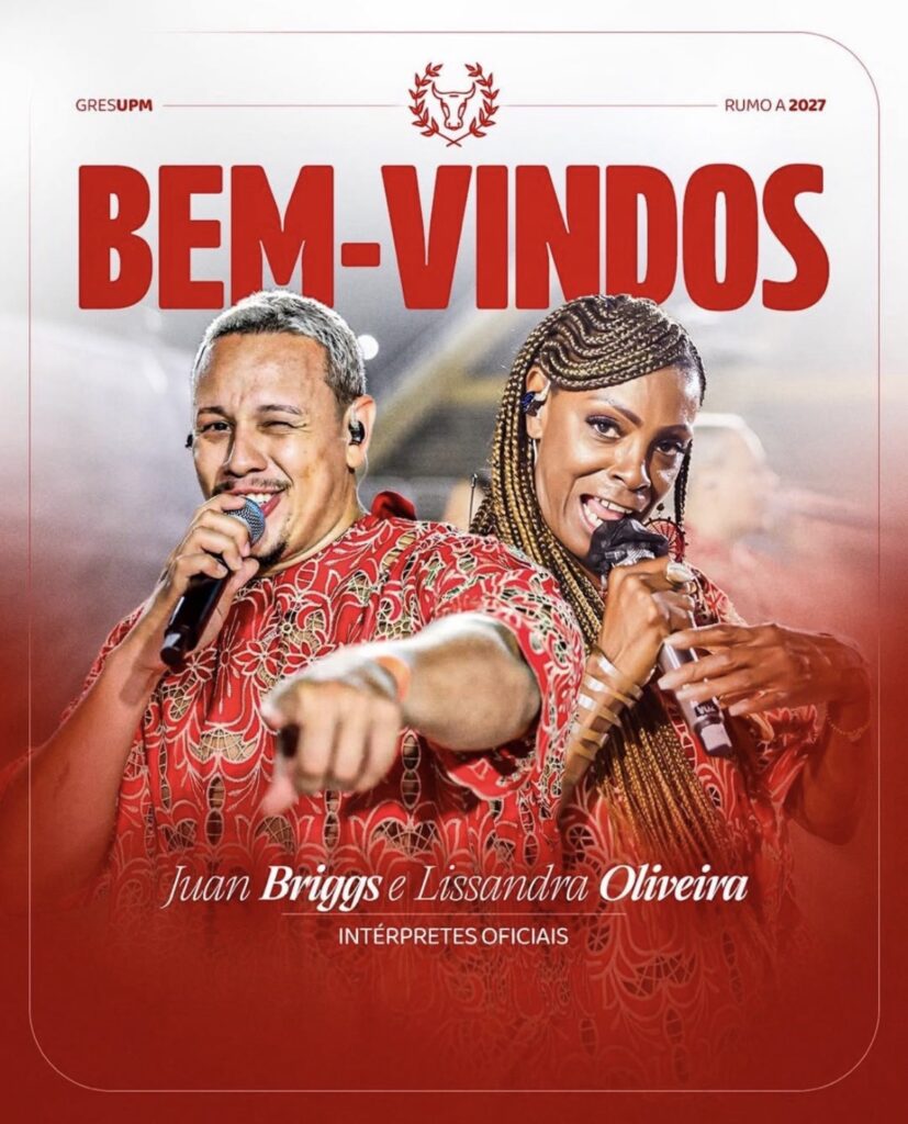 A Unidos de Padre Miguel anunciou neste domingo a chegada de Juan Briggs e Lissandra Oliveira como seus novos intérpretes oficiais rumo ao Carnaval 2027. A dupla assume o microfone principal do Boi Vermelho com a missão de conduzir o canto da Vila Vintém na Marquês de Sapucaí.