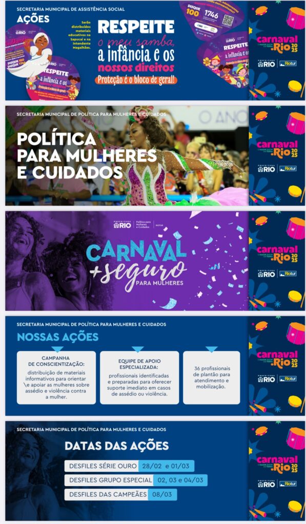 Equipes da Secretaria da Mulher estarão a postos na Marquês de Sapucaí e na Intendente Magalhães, com o objetivo de apoiar foliãs, turistas, trabalhadoras e promover a conscientização sobre violência e importunação sexual. A ação dará informações sobre o trabalho realizado nos 26 equipamentos que formam a rede municipal de enfrentamento à violência contra a mulher na cidade do Rio de Janeiro.